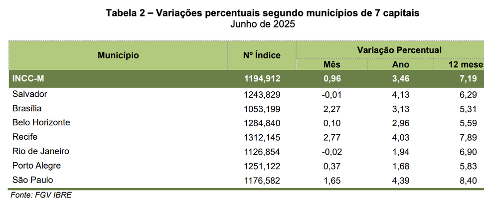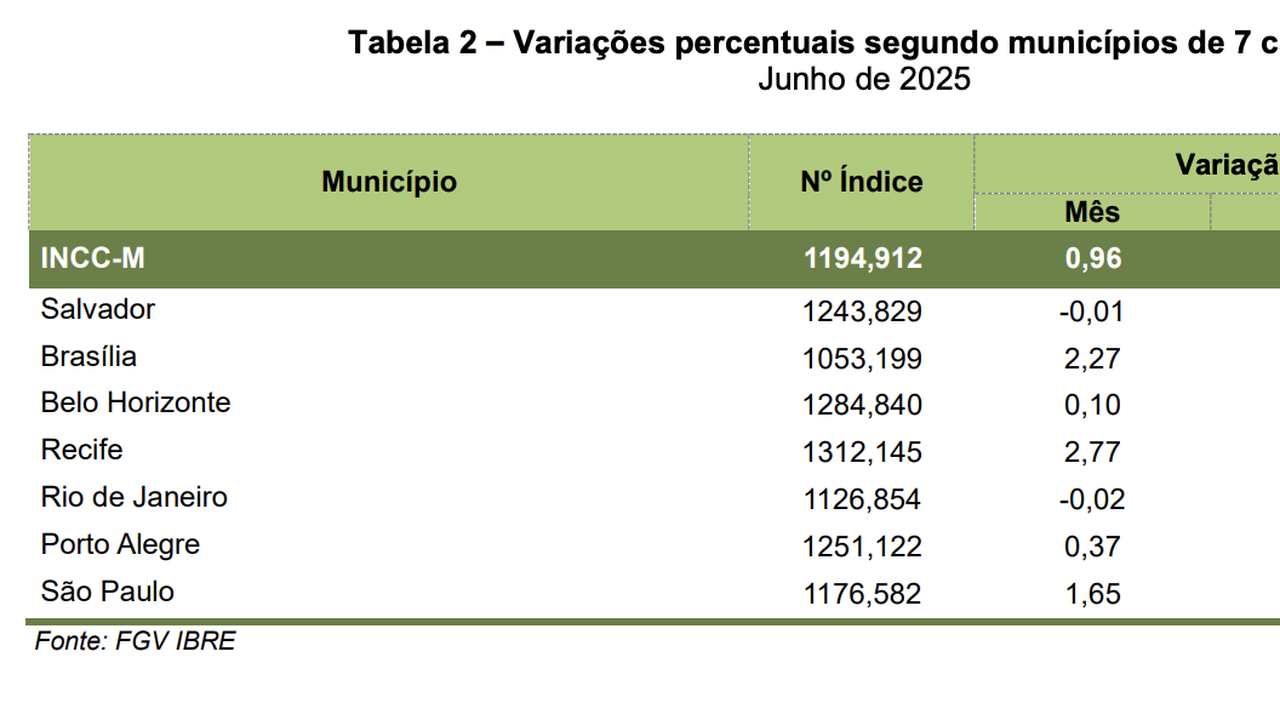 (Brasília-DF, 26/06/2025) Também na manhã desta quarta-feira, 25, o FGV-IBRE divulgou o seu INCC-M (Índice Nacional de Custo da Construção – M) que registrou alta de 0,96% em junho, acima da taxa de 0,26% observada no mês anterior.