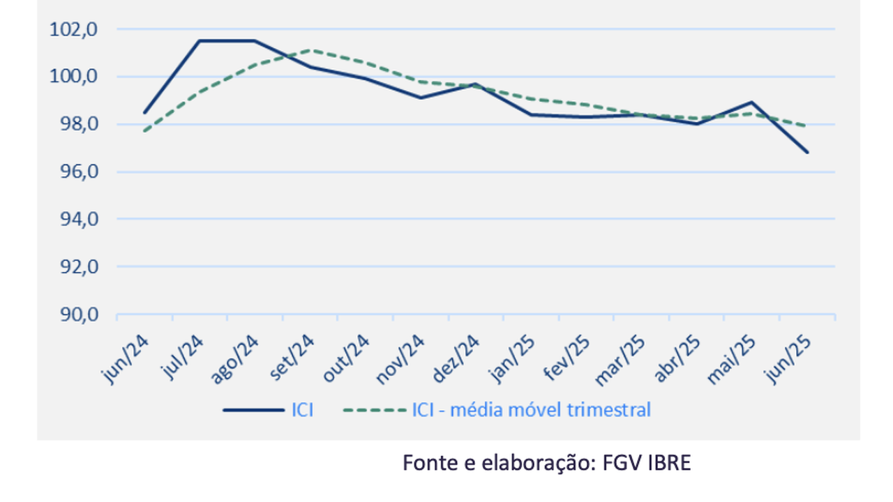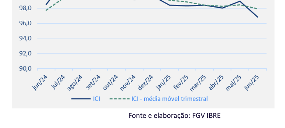 (Brasília-DF, 27/06/2025) Na manhã desta quinta-feira, 26, o FGV-IBRE divulgou o seu Índice de Confiança da Indústria (ICI) que caiu 2,1 ponto em junho, para 96,8 pontos. Em médias móveis trimestrais, o índice recuou 0,5 ponto, para 97,9 pontos.