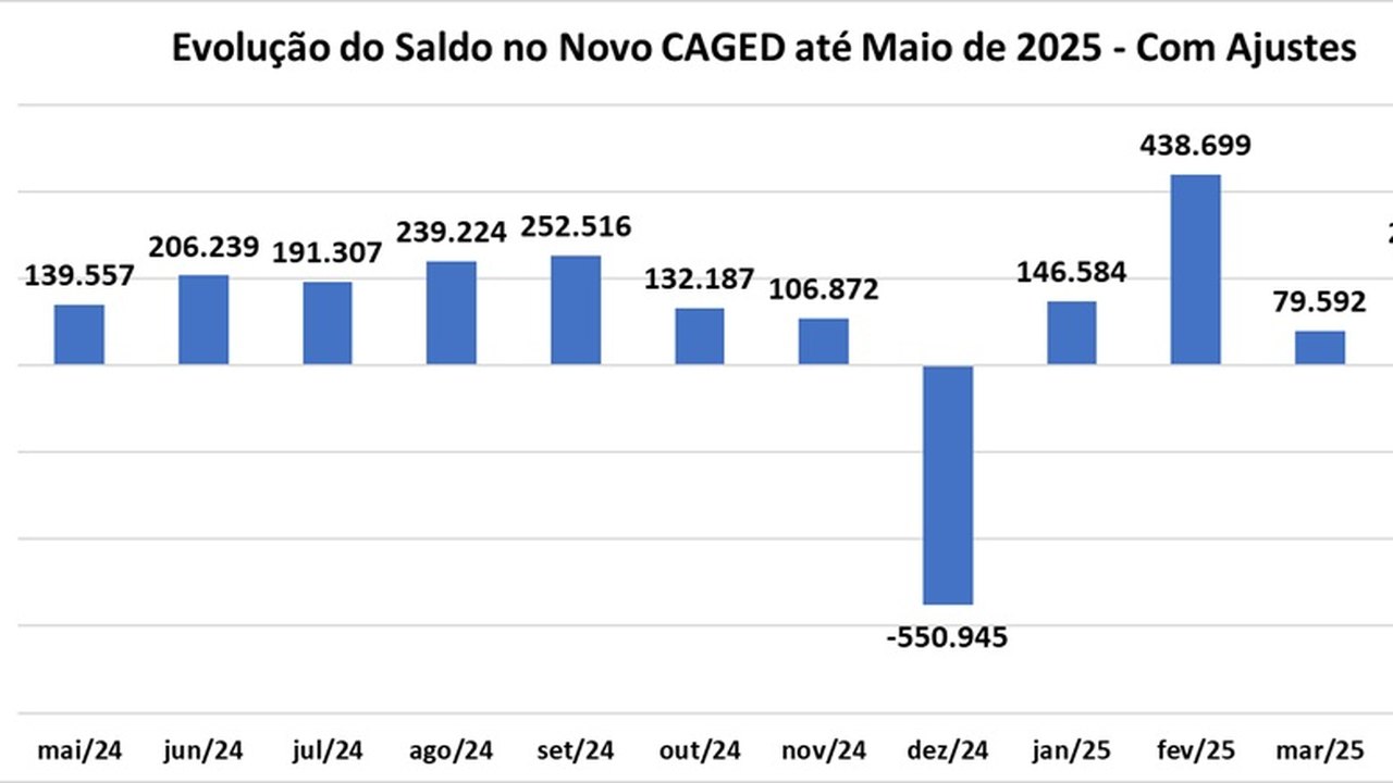 No acumulado do ano (janeiro/2025 a maio/2025), o saldo foi de +1.051.244 empregos, resultado de 11.739.996 admissões e 10.688.752 desligamentos. Nos últimos 12 meses (junho/2024 a maio/2025), o saldo foi de +1.628.644 empregos, resultado de 26.242.868 admissões e 24.614.224 desligamentos.