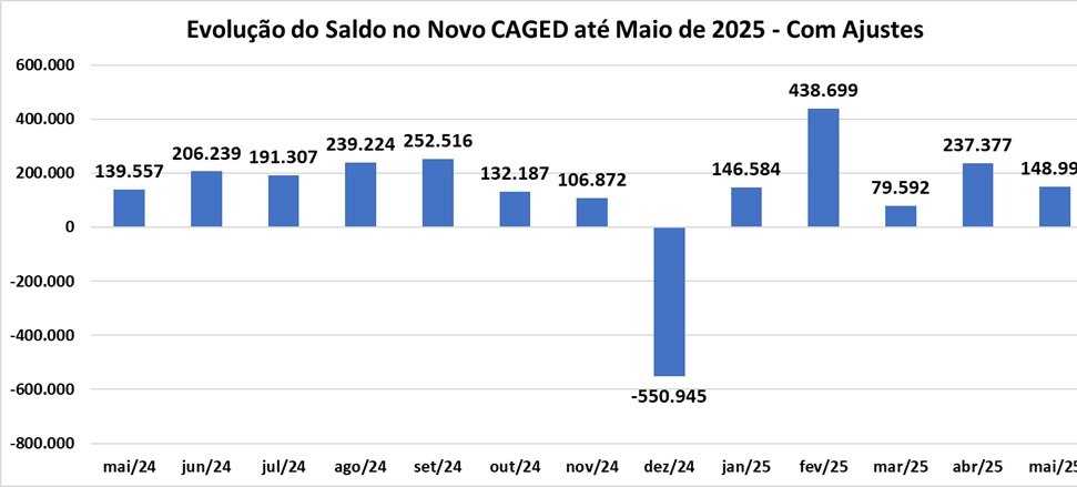 (Brasília-DF, 01/07/2025). Na tarde deste segunda-feira, 30, semana seguinte da divulgação da PNAD Contínua do trimestre terminado em maio, foram divulgados os números do Novo Caged (Cadastro Geral de Empregados e Desempregados), desempenho do emprego celetista no Brasil em maio de 2025. Foi registrado um saldo positivo de +148.992 postos de trabalho.