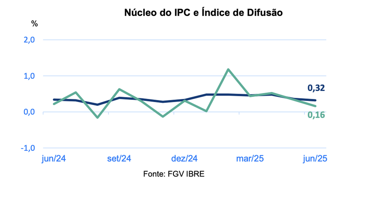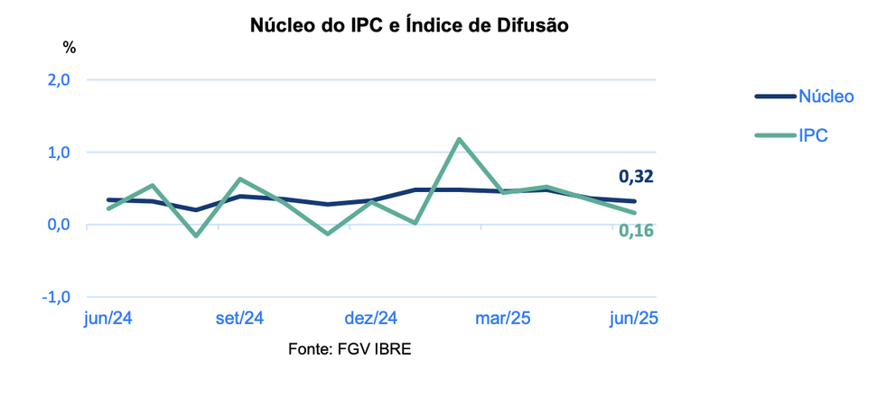 O Núcleo do IPC registrou taxa de 0,32% em junho, abaixo do resultado do mês anterior, de 0,36%. Dos 85 itens componentes do IPC, 40 foram excluídos do cálculo do núcleo. Destes, 28 apresentaram taxas abaixo de 0,03%, linha de corte inferior, e 12 registraram variações acima de 0,55%, linha de corte superior. O Índice de Difusão, que mede a proporção de itens com taxa de variação positiva, ficou em 50,97%, 9,68 pontos percentuais abaixo do registrado em maio, quando o índice foi de 60,65%.