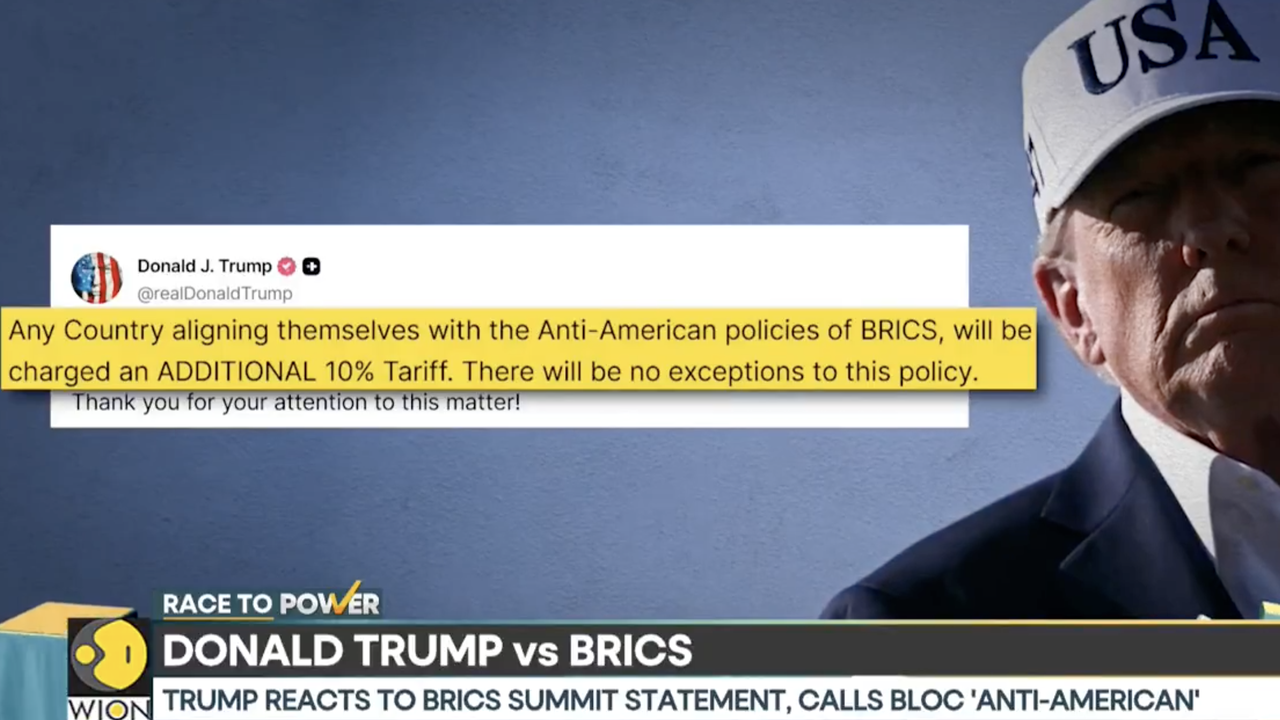 Mesmo sem o EUA serem citados no documento final da Cúpula do Rio, Donald disse que os que estiverem alinhados com posturas antiamericanas dos BRICS terão taxação extra de 10%