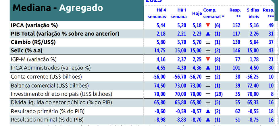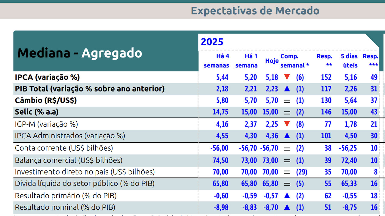 O mercado estima que o IPCA, a inflação oficial, deverá ficar em 5,18%, é a sexta estimativa de queda. O mercado estima que o crescimento econômico está estimado em 2,23% ao final de 2025.