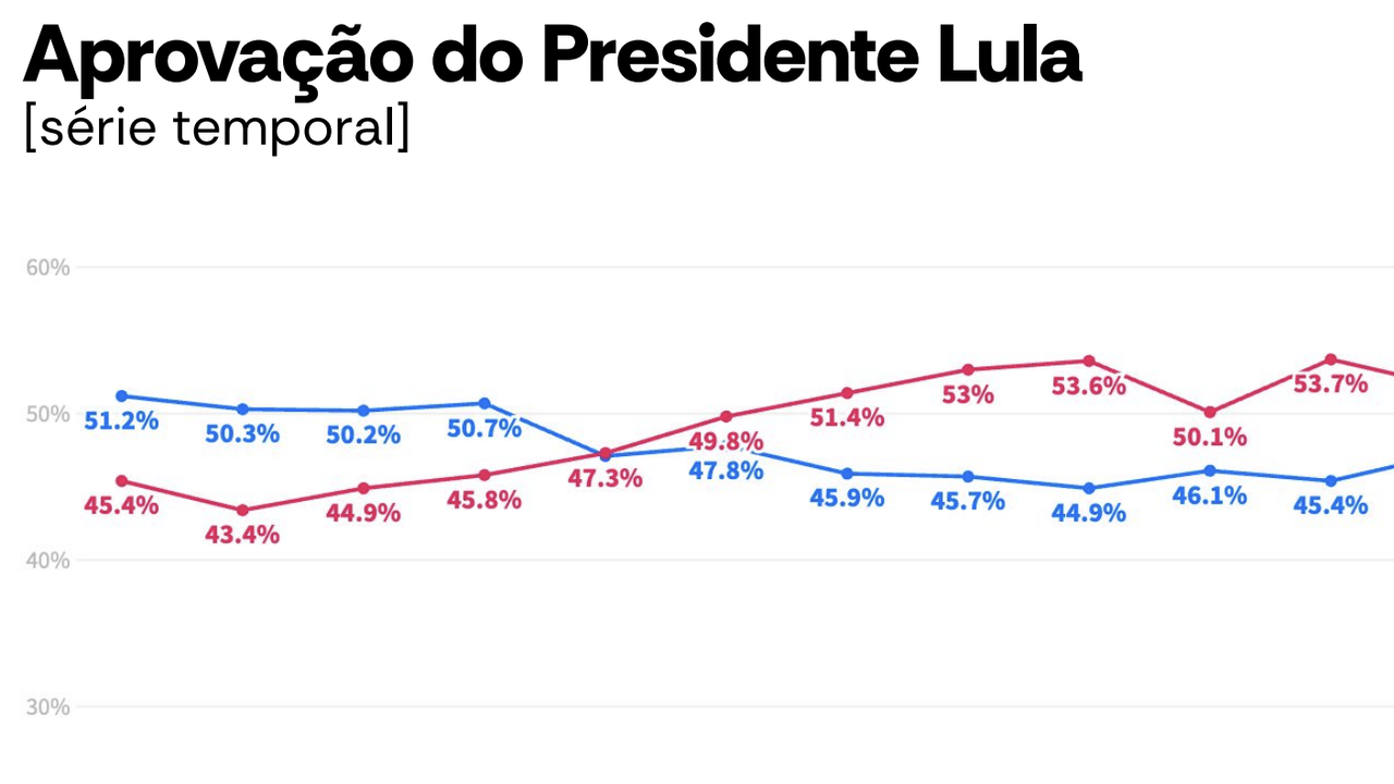 Chamou atenção na pesquisa que a a desaprovação do Governo Lula caiu de 53,7% em maio para 51,8% em junho.