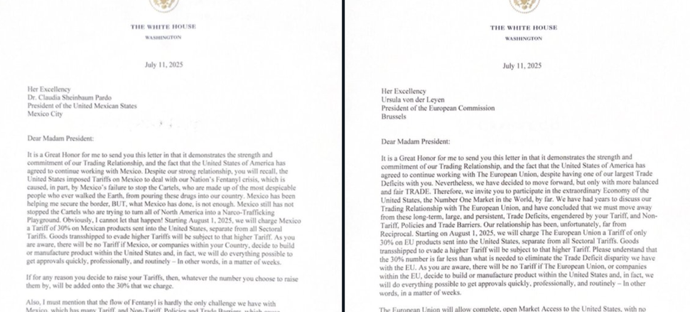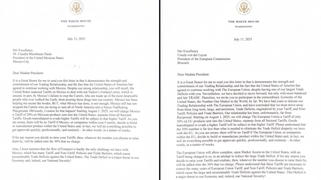 Trump divulgou cartas à presidente da Comissão Europeia, Ursula von der Leyen, e à presidente do México, Claudia Sheinbaum, ambas com data de sexta-feira ,11. E disse que imporia impostos de importação ainda mais altos se um dos parceiros comerciais dos EUA decidisse retaliar.