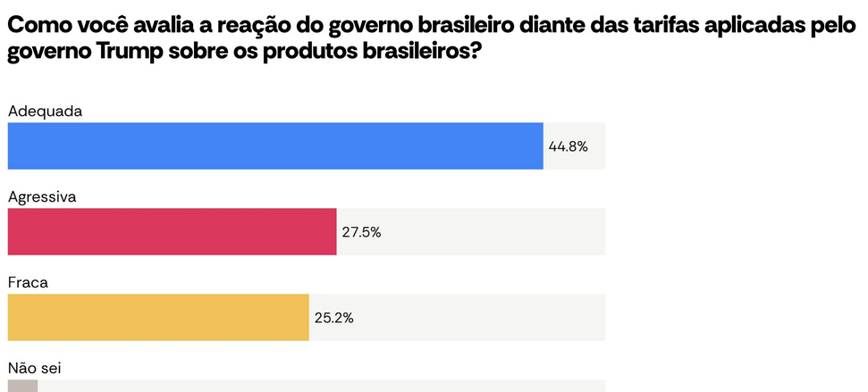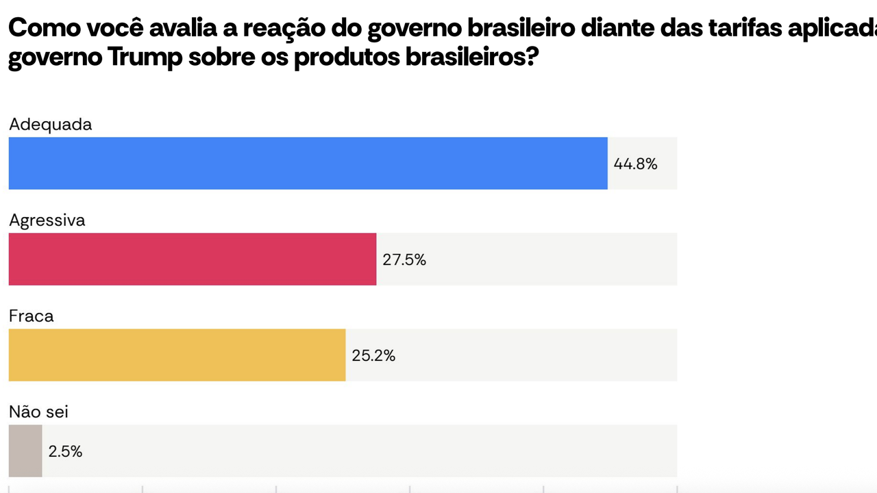 A pesquisa revela que 44,8% consideram adequada a resposta do Governo Lula as tarifas de Trump, enquanto 27,5% consideraram agressiva.