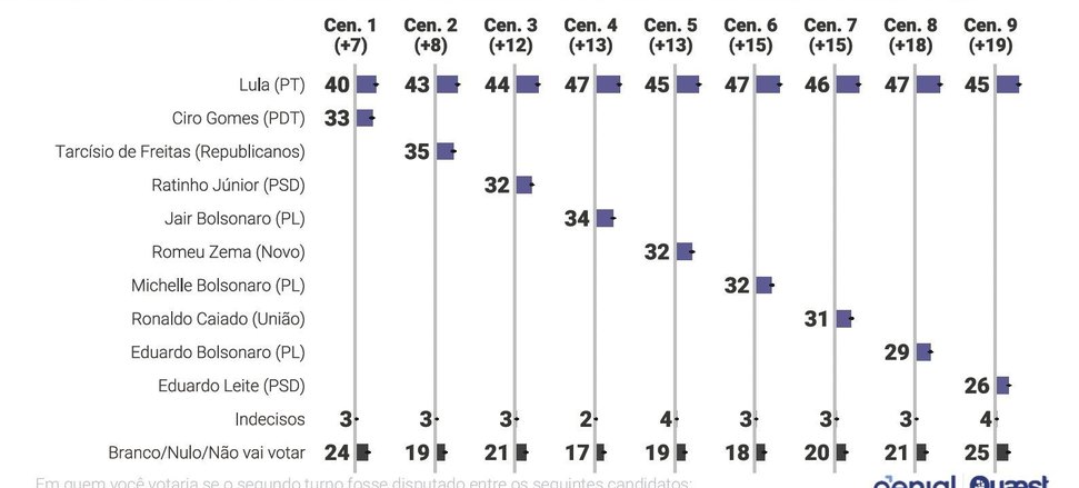 GENIAL/ QUAEST: Lula lidera disputa presidencial em todo os cenários, poderia vencer no primeiro turno se chapa tiver nome radical da família Bolsonaro e Ciro Gomes se mostra o mais competitivo em segundo turno