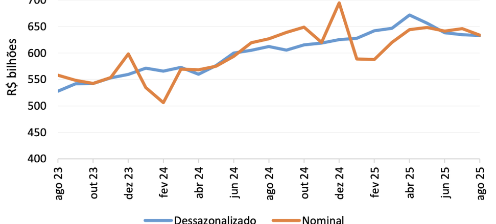 As concessões nominais de crédito somaram R$633,8 bilhões em agosto. As concessões diminuíram 0,2% no mês, com retração de 2,3% nas operações com pessoas jurídicas e incremento de 1,5% nas operações com as pessoas físicas