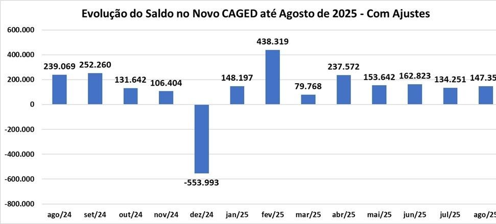 Entre janeiro e agosto de 2025, foram gerados 1.501.930 empregos formais, um crescimento de 3,18%, com saldo positivo em todos os grandes setores da economia. Nos últimos 12 meses, de setembro de 2024 a agosto de 2025, o saldo foi de 1.438.243 vínculos.