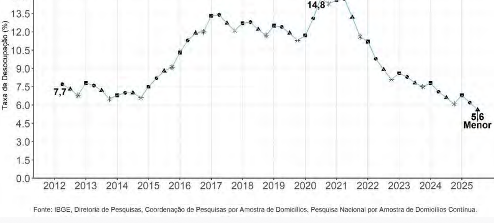 (Brasília-DF, 30/09/2025) Na manhã desta terça-feira, 30, o IBGE divulgou a sua PNAD Contínua do trimestre encerrado em agosto de 2025 que apontou uma taxa de desocupação (5,6%), repetiu a menor da série histórica iniciada em 2012, recuando nas duas comparações: -0,6 ponto percentual (p.p.) frente ao trimestre móvel anterior (6,2%) e -1,0 p.p. ante o mesmo trimestre de 2024 (6,6%).
