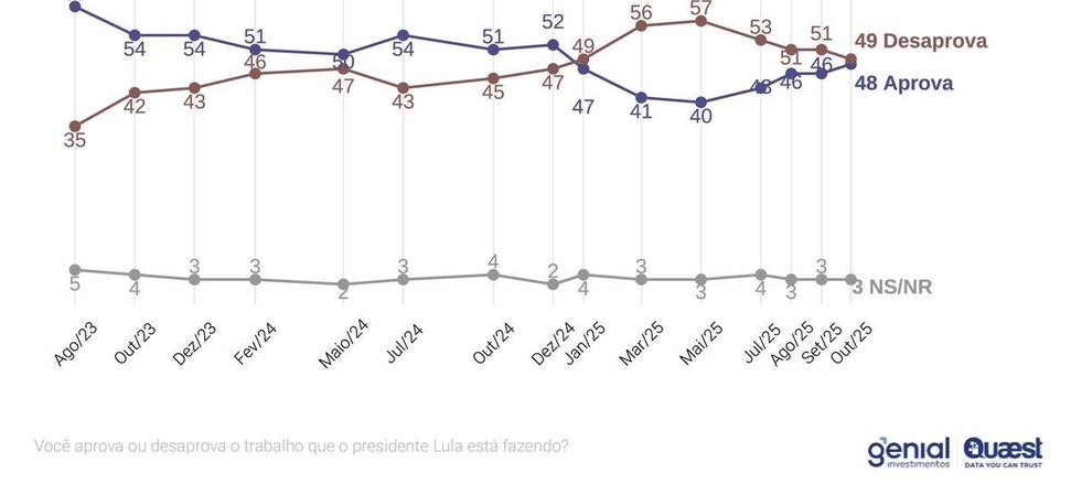 Desaprovação de Lula volta a cair e se estabelece um empate técnico entre aprovação e desaprovação, infrma Genial/Quaest; veja mais comentários sobre a pesquisa