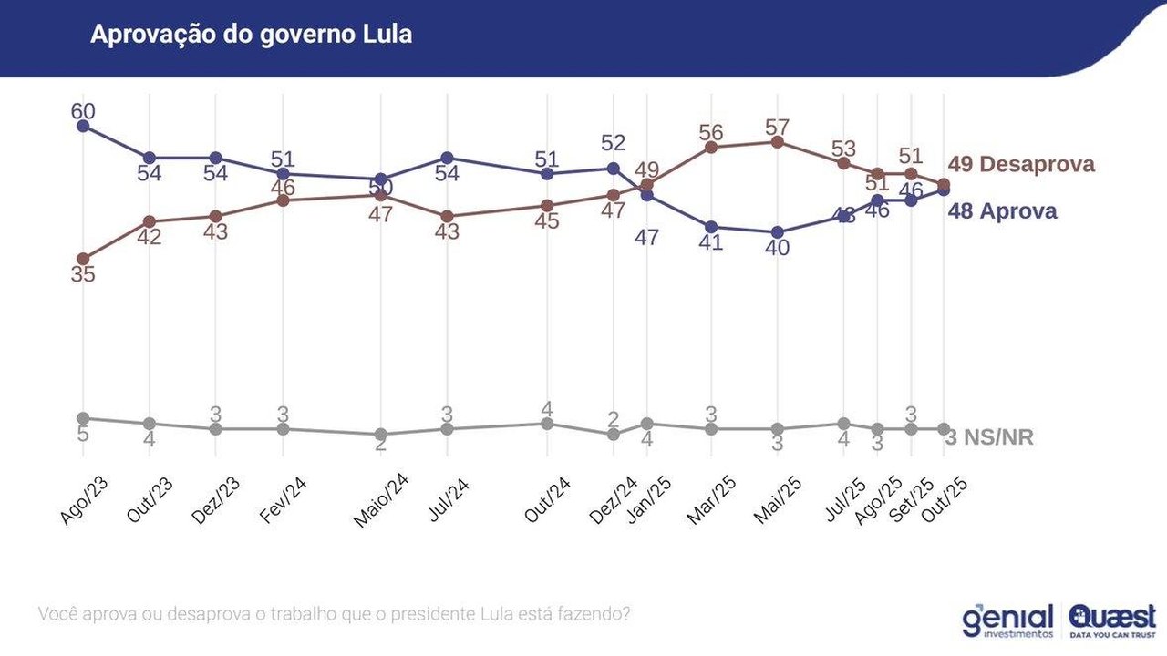 Pesquisa Genial/Quaest mostra que a aprovação do governo Lula chega ao maior nível desde janeiro deste ano. Aprovação e desaprovação aparecem empatadas: 48% a 49%.