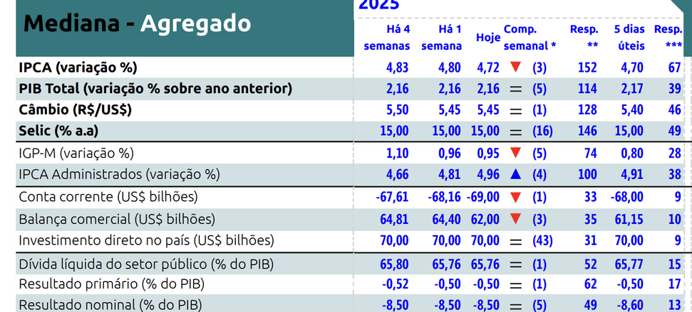 FOCUS: Mercado estima nova queda do IPCA, agora em 4,72% enquanto PIB continua estabilizado, informa pesquisa do BC