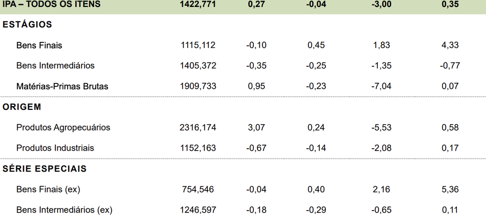 Em outubro, o Índice de Preços ao Produtor Amplo (IPA) caiu 0,04%, invertendo o comportamento observado em setembro, quando registrou alta 0,27%. Analisando os diferentes estágios de processamento, percebe-se que o grupo de Bens Finais apresentou aceleração, passando de -0,10% em setembro para 0,45% em outubro. Seguindo esse comportamento, o índice correspondente a Bens Finais (ex), que exclui os subgrupos de alimentos in natura e combustíveis para o consumo, passou de -0,04% em setembro para 0,40% em outubro. A taxa do grupo Bens Intermediários caiu 0,25% em outubro, após queda de 0,35% no mês anterior. O índice de Bens Intermediários (ex) (excluindo o subgrupo de combustíveis e lubrificantes para a produção) caiu 0,29% em outubro, porém em maior intensidade em relação ao mês anterior, quando registrou queda de 0,18%. O estágio das Matérias-Primas Brutas desacelerou em relação ao mês anterior, passando de uma alta de 0,95% em setembro para uma queda de 0,23% em outubro.