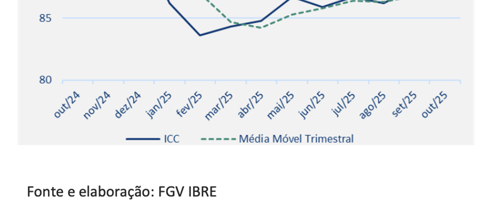 (Brasília-DF, 27/10/2025) Na manhã desta segunda-feira, 27, o FGV-IBRE divulgou o seu o Índice de Confiança do Consumidor (ICC) subiu 1,0 ponto, para 88,5 pontos. Em médias móveis trimestrais, o índice avançou 0,6 ponto, para 87,4 pontos.