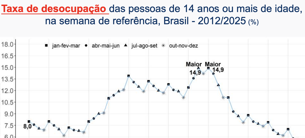 A taxa composta de subutilização (13,9%) foi novamente a mais baixa da série, recuando nas duas comparações: -0,5 p.p. frente ao trimestre anterior (14,4%) e – 1.8 p.p. ante o mesmo trimestre de 2024 (15,7%). A população subutilizada (15,8 milhões) chegou ao menor contingente desde o trimestre encerrado em dezembro de 2014, recuando nas duas comparações: -4,0% (menos 664 mil) no trimestre e -11,4% (menos 2,0 milhões) no ano.