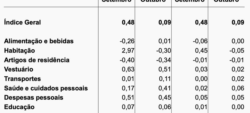 Em outubro, três dos nove grupos de produtos e serviços pesquisados vieram com variação negativa: Artigos de residência (-0,34%), Habitação (-0,30%) e Comunicação (-0,16%). No lado das altas, as variações ficaram entre o 0,01% de Alimentação e bebidas e o 0,51% de Vestuário.
