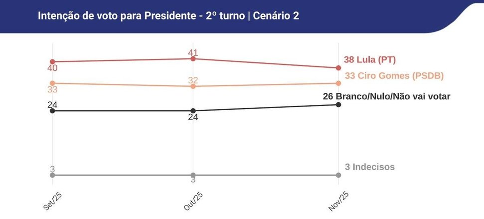 Contra Ciro Gomes, a distância também caiu. Lula foi de 41% para 38%, enquanto Ciro foi de 32% para 33%. É o cenário mais apertado considerando apenas os candidatos com elegibilidade garantida hoje.