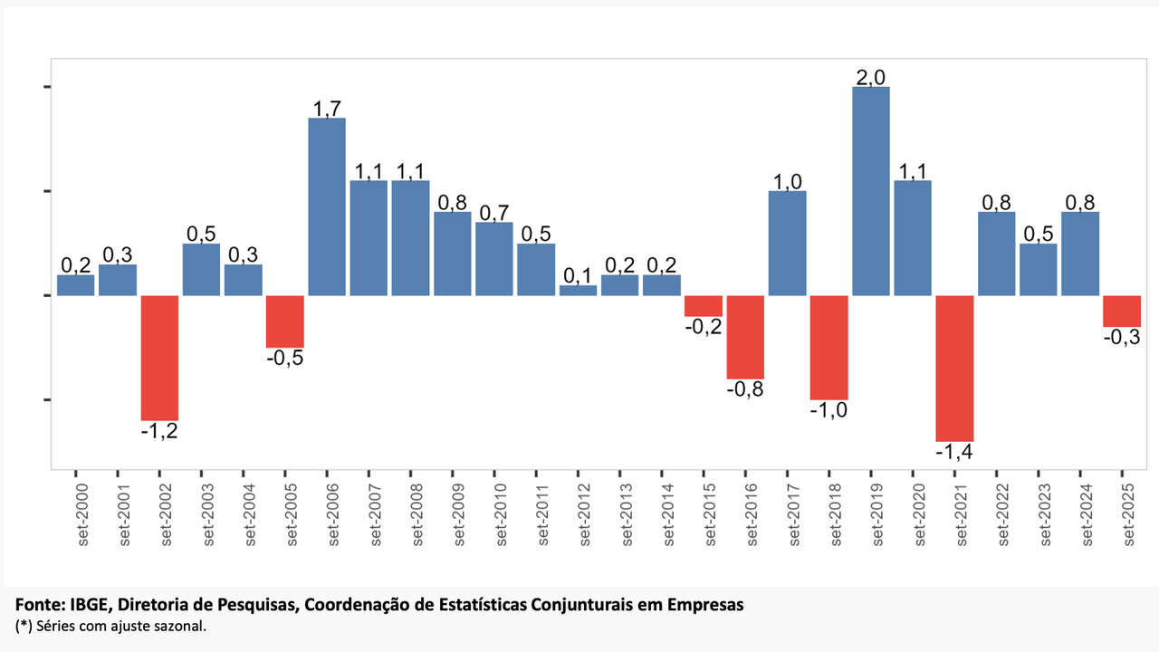 Houve predominância de taxas negativas na passagem de agosto para setembro de 2025, na série com ajuste sazonal, nas atividades do comércio varejista. As taxas negativas foram registradas em 6 dos 8 setores: Livros, jornais, revistas e papelaria (-1,6%), Tecidos, vestuário e calçados (-1,2%), Combustíveis e lubrificantes (-0,9%), Equipamentos e material para escritório, informática e comunicação (-0,9%), Móveis e Eletrodomésticos (-0,5%) e Hiper, supermercados, produtos alimentícios, bebidas e fumo (-0,2%).