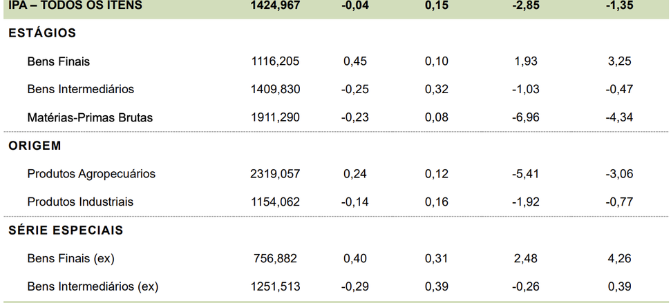 Em novembro, o Índice de Preços ao Produtor Amplo (IPA) subiu 0,15%, invertendo o comportamento observado em outubro, quando registrou queda de 0,04%. Analisando os diferentes estágios de processamento, percebe-se que o grupo de Bens Finais apresentou desaceleração, passando de 0,45% em outubro para 0,10% em novembro. Seguindo esse comportamento, o índice correspondente a Bens Finais (ex), que exclui os subgrupos de alimentos in natura e combustíveis para o consumo, passou de 0,40% em outubro para 0,31% em novembro. A taxa do grupo Bens Intermediários avançou 0,32% em novembro, após queda de 0,25% no mês anterior. O índice de Bens Intermediários (ex) (excluindo o subgrupo de combustíveis e lubrificantes para a produção) subiu 0,39% em novembro, contra queda de 0,29% mês anterior. O estágio das Matérias-Primas Brutas apresentou elevação da taxa em relação ao mês anterior, passando de uma queda de 0,23% em outubro para uma alta de 0,08% em novembro.