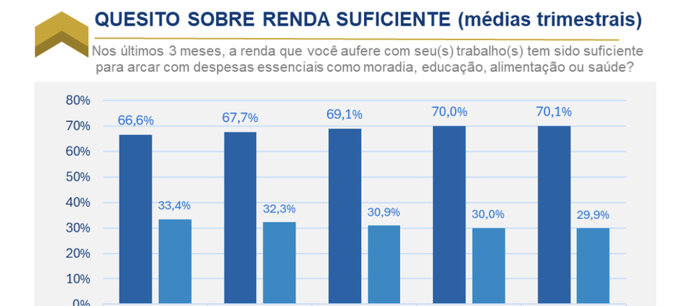 O resultado, com dados do trimestre findo em outubro de 2025, mostra que a maior parte dos respondentes (70,1%) afirma conseguir pagar suas contas essenciais nos últimos 3 meses com a renda auferida no período de referência. Esse resultado é o melhor observado entre as 5 observações coletadas até então.