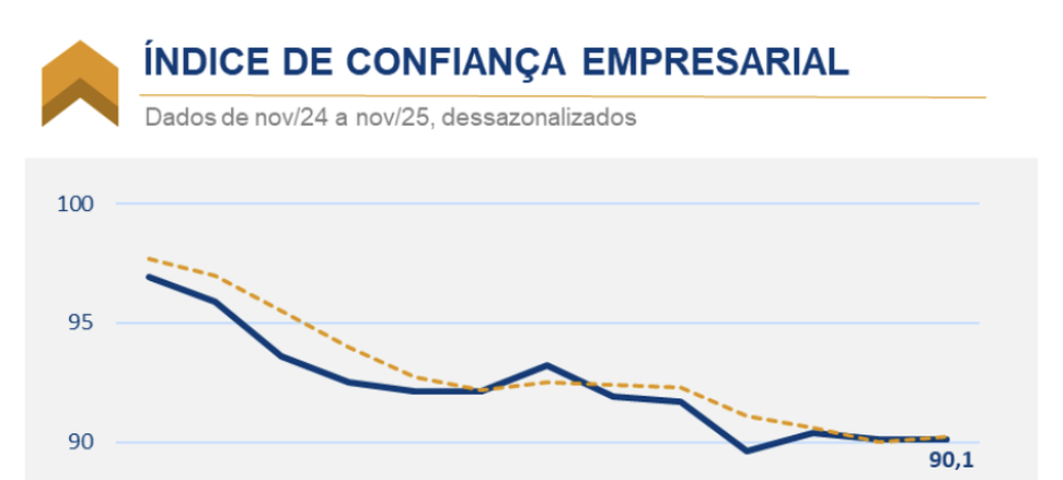 (Brasília-DF, 01/12/2025) Na manhã desta segunda-feira, 01, o FGV-IBRE divulgou a seu Índice de Confiança Empresarial (ICE) que ficou estável em novembro, em 90,1 pontos. Na métrica de médias móveis trimestrais, o índice volta a registrar tendência de alta, com um avanço de 0,2 ponto, após cinco meses em queda.