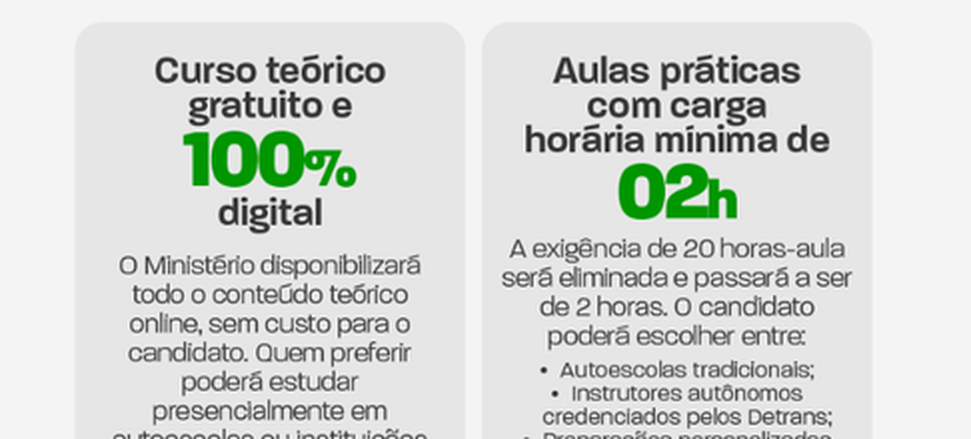 A resolução prevê curso teórico gratuito e digital, flexibilização das aulas práticas e abertura para instrutores credenciados pelos Detrans, reduzindo a dependência de modelos únicos e aumentando as opções para o cidadão. A abertura do processo poderá ser feita pelo site do Ministério dos Transportes ou pela Carteira Digital de Trânsito (CDT).