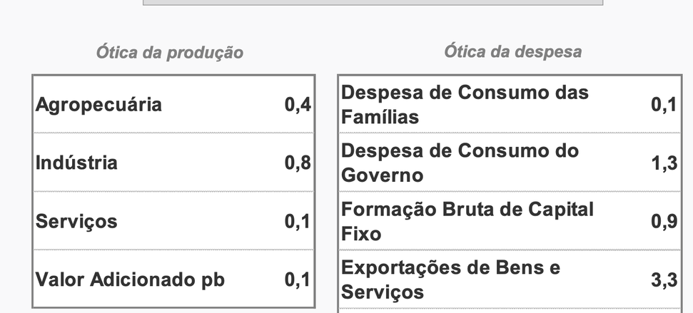 Pela ótica da despesa, a Despesa de Consumo das Famílias teve variação positiva de 0,1%, a Despesa de Consumo do Governo cresceu 1,3% e a Formação Bruta de Capital Fixo obteve alta de 0,9% em relação ao trimestre imediatamente anterior.