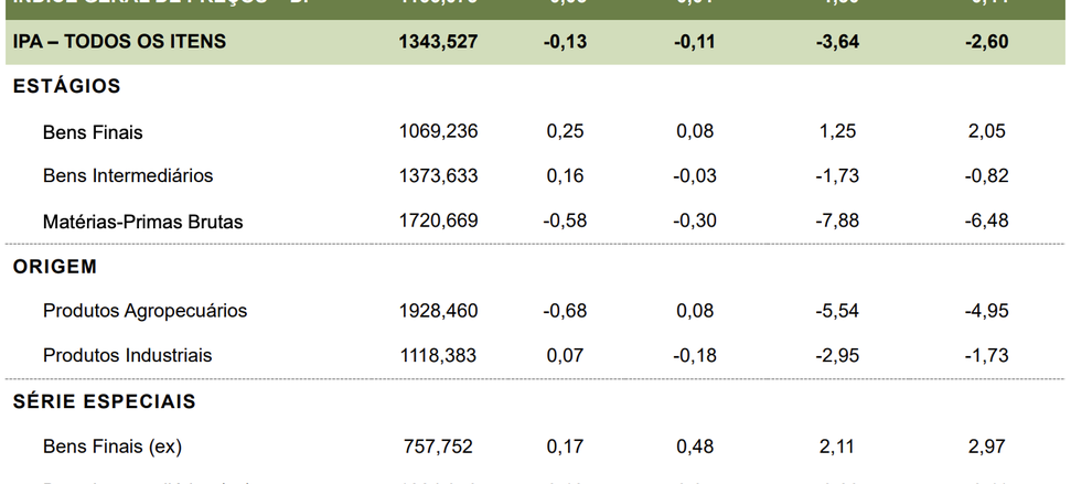 O Índice de Preços ao Produtor Amplo (IPA) cai 0,11% em novembro.