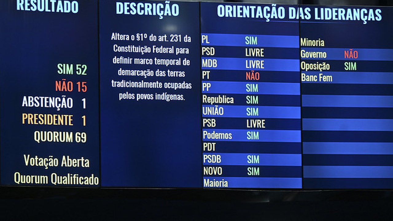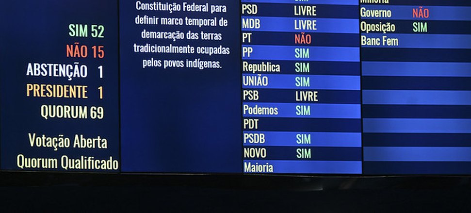O texto insere na Constituição a tese do marco temporal, determinando que somente poderão ser demarcadas as terras que estavam sob a posse dos indígenas na data da promulgação da Constituição, em 5 de outubro de 1988. Aprovada em dois turnos, a proposta segue para a Câmara dos Deputados.