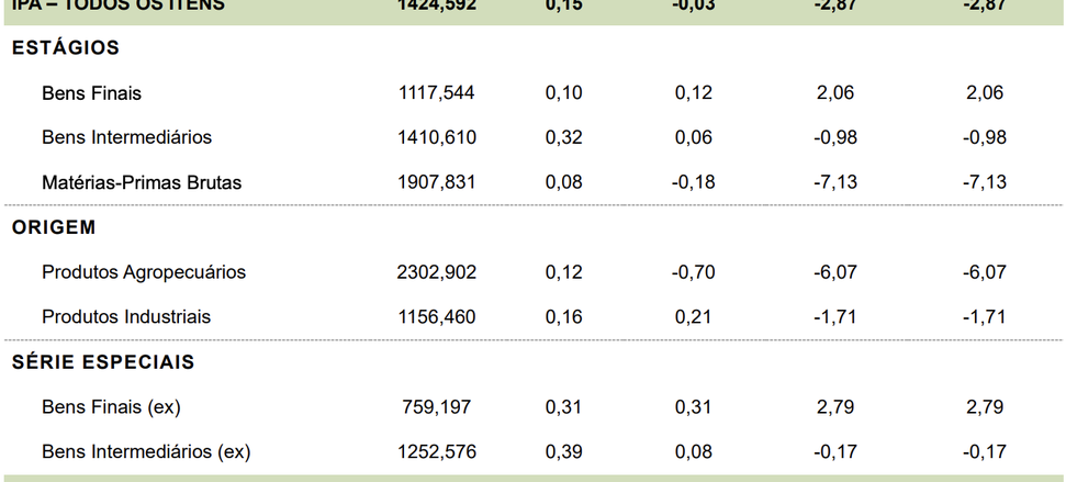 Em dezembro, o Índice de Preços ao Produtor Amplo (IPA) caiu 0,03%, invertendo o comportamento observado em novembro, quando registrou alta de 0,15%. Analisando os diferentes estágios de processamento, percebe-se que o grupo de Bens Finais apresentou avanço, passando de 0,10% em novembro para 0,12% em dezembro. O índice correspondente a Bens Finais (ex), que exclui os subgrupos de alimentos in natura e combustíveis para o consumo, repetiu a taxa registrada em novembro, quando foi de 0,31%. A taxa do grupo Bens Intermediários subiu 0,06% em dezembro, porém com menor intensidade que novembro, quando o índice subira 0,32%. O índice de Bens Intermediários (ex) (excluindo o subgrupo de combustíveis e lubrificantes para a produção) subiu 0,08% em dezembro, após alta de 0,39% mês anterior. O estágio das Matérias-Primas Brutas apresentou recuo da taxa em relação ao mês anterior, passando de uma alta de 0,08% em novembro para uma queda de 0,18% em dezembro.