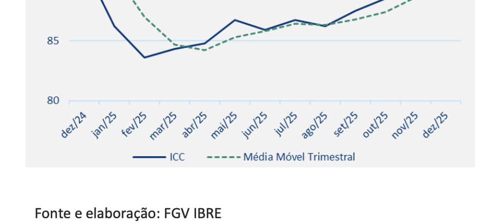 (Brasília-DF, 22/12/2025) Na manhã desta segunda-feira, 22, o FGV-IBRE informou que o Índice de Confiança do Consumidor (ICC) subiu 0,4 ponto em dezembro, para 90,2 pontos, maior nível desde dezembro de 2024 (91,3 pts.). Em médias móveis trimestrais, o índice avançou 0,9 ponto, para 89,5 pontos.