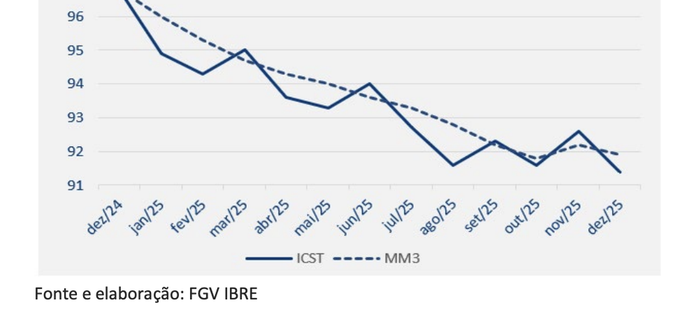 (Brasília-DF, 23/12/2025). Nesta terça-feira, 23, o FGV-IBRE divulgou o seu Índice de Confiança da Construção (ICST) que caiu 1,2 ponto em dezembro, para 91,4 pontos, menor nível desde maio de 2021 (87,4 pontos). Na média móvel trimestral, o índice cedeu 0,3 ponto.