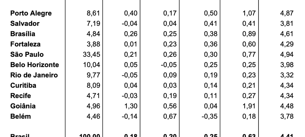 Quanto aos índices regionais , dez das onze áreas de abrangência tiveram alta em dezembro. A maior variação foi observada em Porto Alegre (0,50%), por conta das altas nas passagens aéreas (11,32%) e na energia elétrica residencial (5,86%). Já o menor resultado ocorreu em Belém (-0,35%), com as quedas na hospedagem (-53,72%) e nos itens de higiene pessoal (-1,60%)