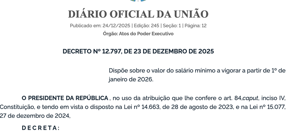(Brasília-DF, 24/12/2025) Na manhã desta quarta-feira, 24, o Diário Oficial da União traz o Decreto nº 12.797, assinado pelo presidente Luiz Inácio Lula da Silva, que oficializa o reajuste do salário mínimo a partir de 1º de janeiro de 2026. O valor, que atualmente é de R$ 1.518, passará a R$ 1.621, fruto de um reajuste de 6,79%. O valor diário do mínimo corresponderá a R$ 54,04, e o valor horário, a R$ 7,37.
