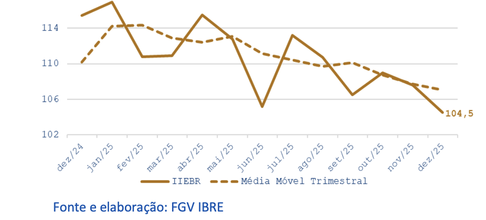 (Brasília-DF, 06/01/2026) Nessa segunda-feira, 05, o FGV-IBRE divulgou o seu Indicador de Incerteza da Economia (IIE-Br) que recuou 3,1 pontos em dezembro, para 104,5 pontos, menor nível desde março de 2024 (103,8 pts.). Na métrica de médias móveis trimestrais, o indicador recuou 0,7 ponto, para 107,0 pontos.