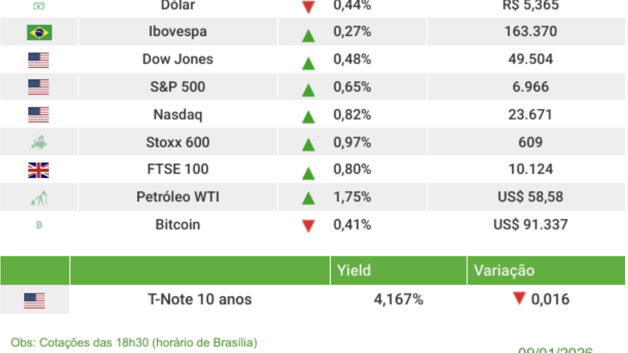 (Brasília-DF, 09/01/2025). Nesta sexta-feira, 09, último dia da primeira semana completa do ano de 2026 revelou que o Ibovespa subiu com a reação de investidores a novos dados do mercado de trabalho nos Estados Unidos.