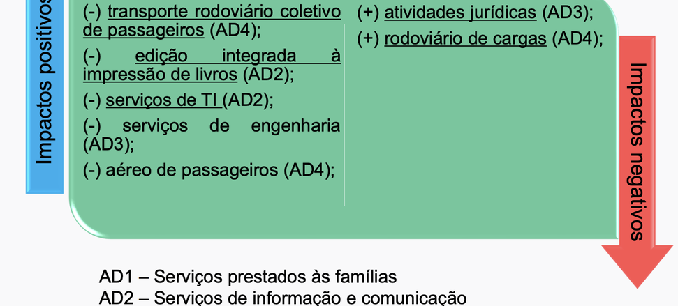 Os principais impactos positivos vieram dos setores de informação e comunicação (3,4%) e o de transportes, serviços auxiliares aos transportes e correio (2,5%). Eles foram impulsionados, principalmente, pelo aumento da receita em portais, provedores de conteúdo e outros serviços de informação na internet; desenvolvimento de programas de computador sob encomenda; consultoria em tecnologia da informação; atividades de TV aberta; desenvolvimento e licenciamento de softwares; e tratamentos de dados, provedores de serviços de aplicação e serviços de hospedagem na Internet, no primeiro ramo; e em rodoviário de cargas; transporte aéreo de passageiros; concessionárias de rodovias; rodoviário coletivo de passageiros; logística de transporte de cargas; e dutoviário, no último.