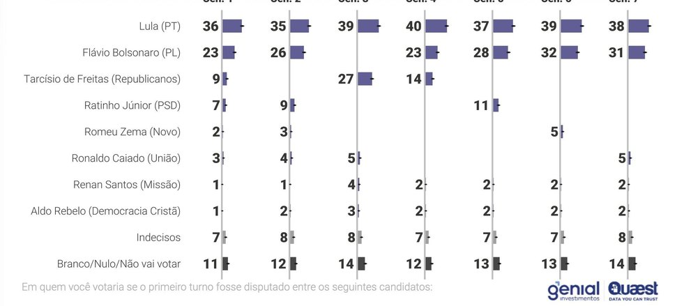 Flavio Bolsonaro se consolida na segunda posição: no cenário que inclui Tarcísio e os demais nomes ele aparece com 23%; sem o governador de São Paulo, ele vai para 26%. Sem Flávio, Ratinho e Zema, Tarcísio chegaria a 27%.