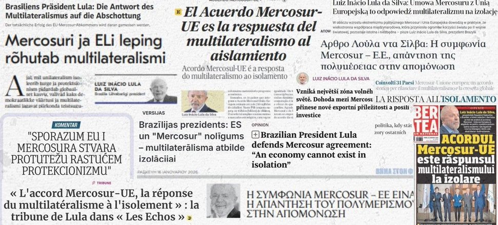 (Brasília-DF, 17/01/2026) Por conta do acordo União Europeia-Mercosul que está sendo assinado em Assunção, no Paraguai, neste sábado, 17, o presidente do Brasil, Luiz Inácio Lula da Silva, fez artigo que foi publicado em 27 jornais em diversos países ainda nessa sexta-feira, 16, quando ele se encontro com a presidente da Comissão Europeia, Ursula von der Leyen. A chefe da Comissão Europeia veio dizer um “muito obrigado” a Lula que ela considerou “fundamental” para a assinatura do acordo.