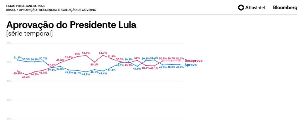 (Brasília-DF, 22/01/2026) Na manhã desta quinta-feira, 22, a AtlasIntel em parceria com a Bloomberg divulgou pesquisa sobre aprovação do presidente Lula, aprovação do Governo Lula e sobre a aprovação dos líderes políticos