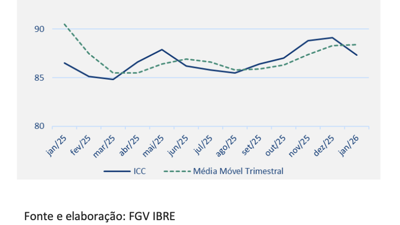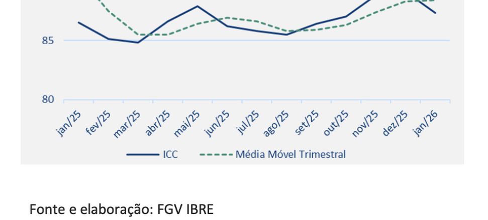(Brasília-DF, 26/01/2026) Na manhã desta segunda-feira, 26, o FGV-IBRE divulgou a sua Índice de Confiança do Consumidor (ICC) que caiu 1,8 pontos em janeiro, para 87,3 pontos, menor nível desde outubro de 2025 (87,0 pts.). Em médias móveis trimestrais, o índice avançou 0,1 ponto, para 88,4 pontos.