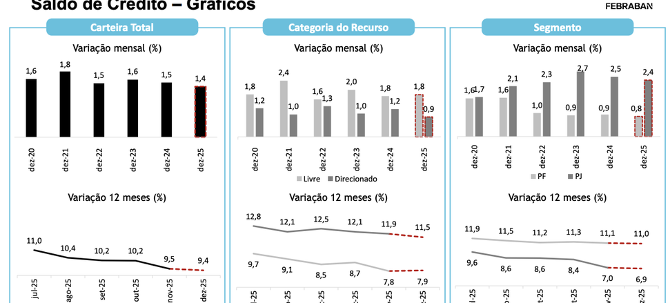(Brasília-DF, 26/01/2026) Nesta segunda-feira, 26, no início da semana em que deverá ser iniciada a primeira reunião do Comitê de Política Monetário (Copom) de 2026, a Febraban divulgou a sua Pesquisa Especial de Crédito da Febraban mostrando que mesmo com juro alto o saldo da carteira de crédito total deve crescer 1,4% em dezembro, fechando 2025 com alta de 9,4%.