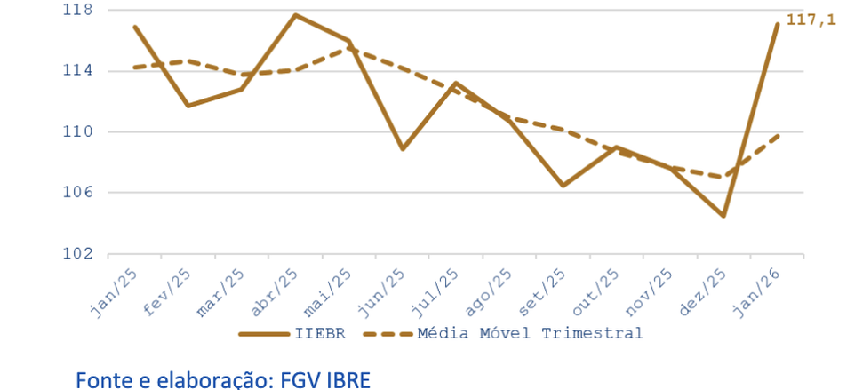 (Brasília-DF, 30/01/2026) Nesta sexta-feira, 30, o FGV-IBRE divulgou o seu Indicador de Incerteza da Economia (IIE-Br) que subiu 12,6 pontos em janeiro, para 117,1 pontos, maior nível desde abril de 2025 (117,1 pts.). Na métrica de médias móveis trimestrais, o indicador subiu 2,7 pontos, para 109,7 pontos.