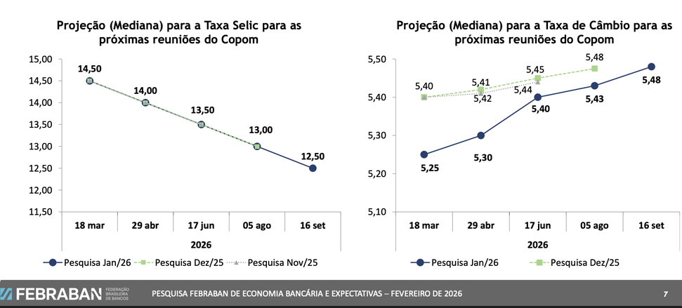 (Brasília-DF, 18/02/2026). Nesta semana em que tivemos do Carnaval, o Banco Central não divulgou a sua tradicional pesquisa Focus, feita junto mercado, mas a Febraban ( Federação Brasileira dos Bancos divulgou, hoje, 18 a sua Pesquisa Febraban de Economia Bancária e Expectativas do período feita junto a 21 bancos.