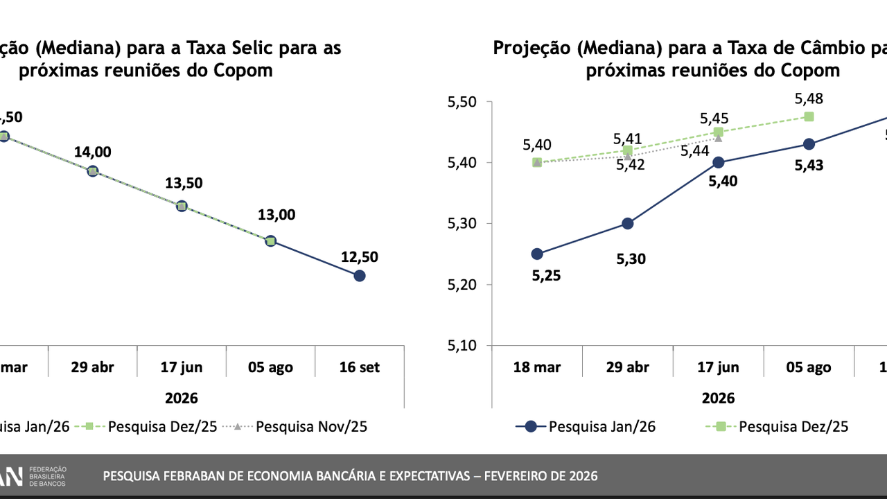 Os bancos brasileiros avaliam que o Copom irá cortar a taxa básica de juros (Selic) em 0,50 ponto percentual em março, seguindo com este ritmo de cortes nas próximas reuniões. Além disso, pouco mais de 60% dos participantes acreditam que os juros básicos devem ficar abaixo de 12,25% ao ano em dezembro, nível inferior ao da atual expectativa trazida pelo Boletim Focus, do Banco Central.