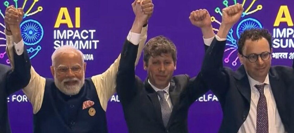 Lá em Nova Delhi, na Índia, a imagem em que Dario Amodei, que foi um dos fundadores do ChatGPT, hoje CEO da Antropic, não dando as mãos a Sam Altman, CEO da OpenIA, dona do ChatGPT, na foto com chefes de Estado na Cúpula Internacional de Inteligência Artificial revela que os destinos do Planeta não podem ficar nas mãos de bilionários.
