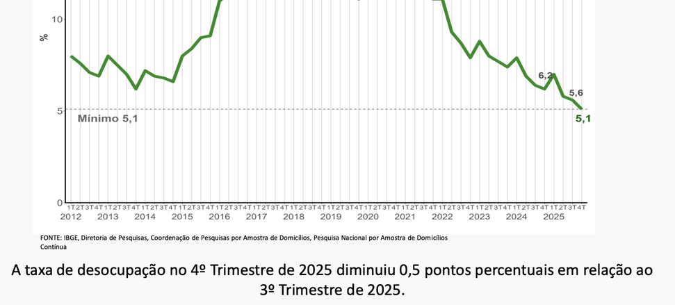 (Brasília-DF, 20/02/2026) O IBGE divulgou a sua PNAD Contínua do 4° trimestre de 2025 revelando que a taxa de desocupação do país foi de 5,1%, redução significativa frente ao trimestre anterior (5,6%) e recuando 1,1 p.p. ante o mesmo trimestre móvel de 2024 (6,2%).