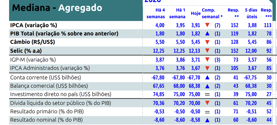 FOCUS: Mercado faz nova estimativa de queda do IPCA, agora em 3,91% e já estima a taxa Selic chegando a 12,13%, a primeira estimativa que o mercado faz abaixo das outros previsões