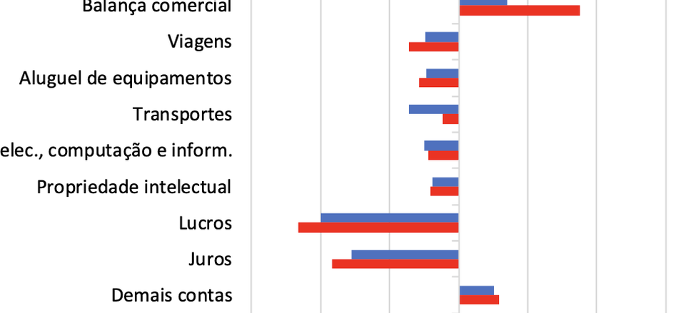 O déficit em renda primária somou US$8,3 bilhões em janeiro de 2026, aumento de 18,7% comparativamente ao déficit de US$7,0 bilhões em janeiro de 2025. As despesas líquidas com juros alcançaram US$3,7 bilhões, aumento de 18,3%, e as despesas líquidas com lucros e dividendos totalizaram US$4,7 bilhões, aumento de 16,8%.